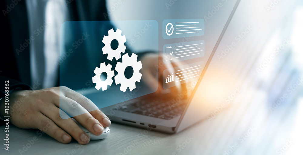 Business process optimisation.Robotic process automation or RPA.Engineer setting up automated software.Automated industrial technology with digital transformation.