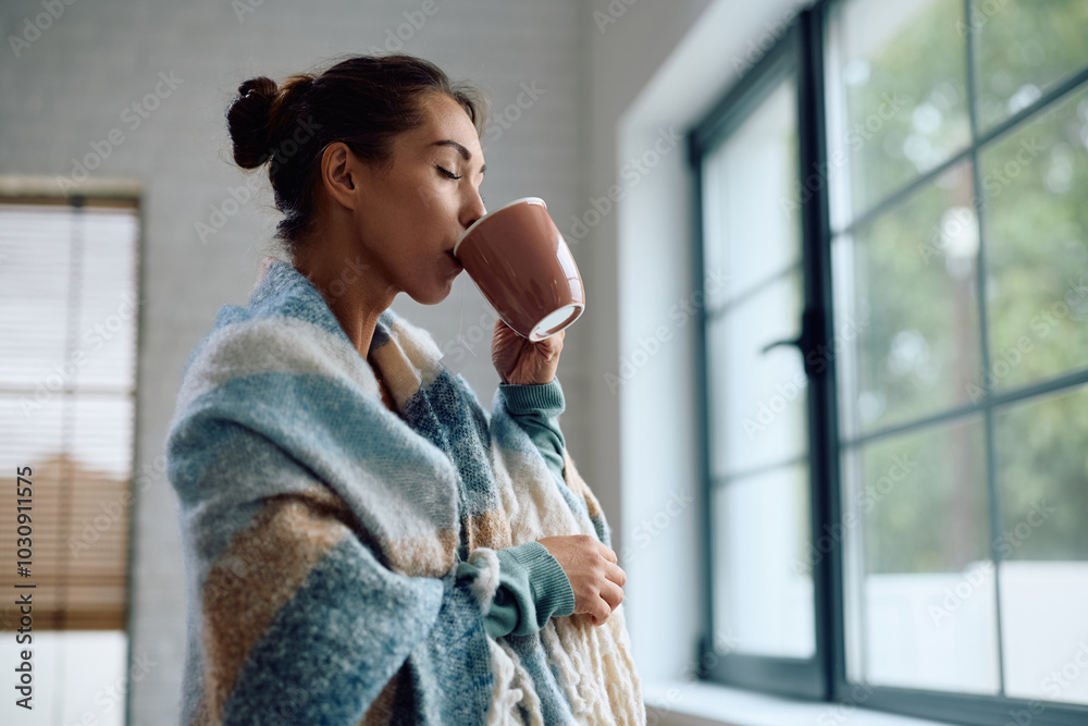 Young woman wrapped in blanket enjoying in cup of warm tea at home.