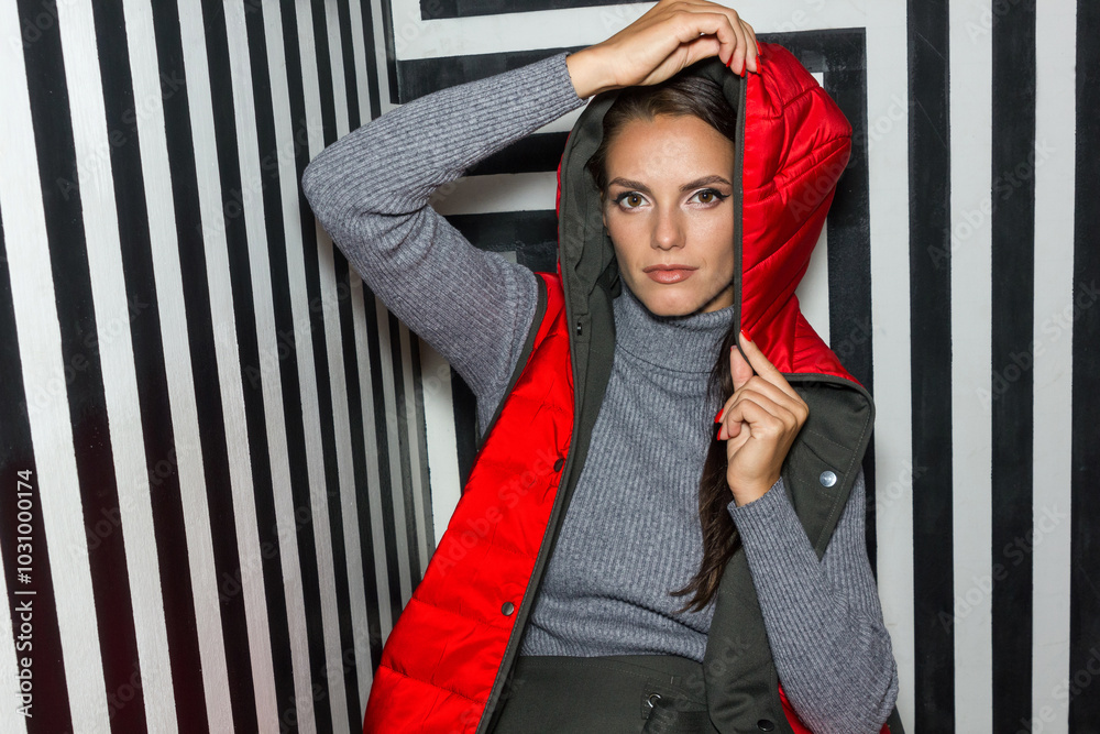 Young woman in red quilted down vest poses gracefully on creative striped background.
