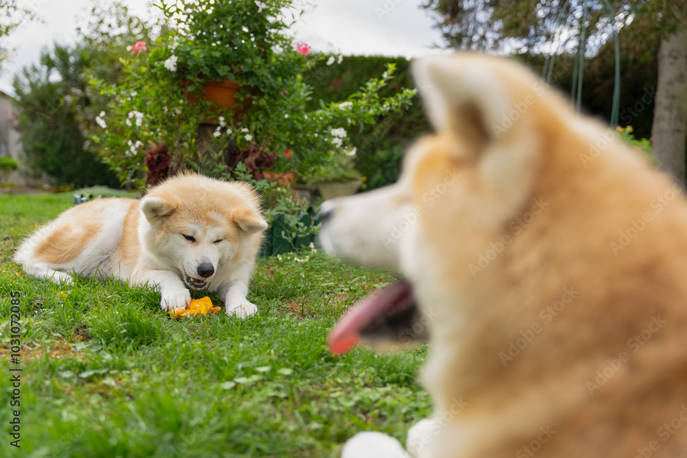 un jeune akita en premier plan, avec au deuxième plan, un akita mangeant une courge orange