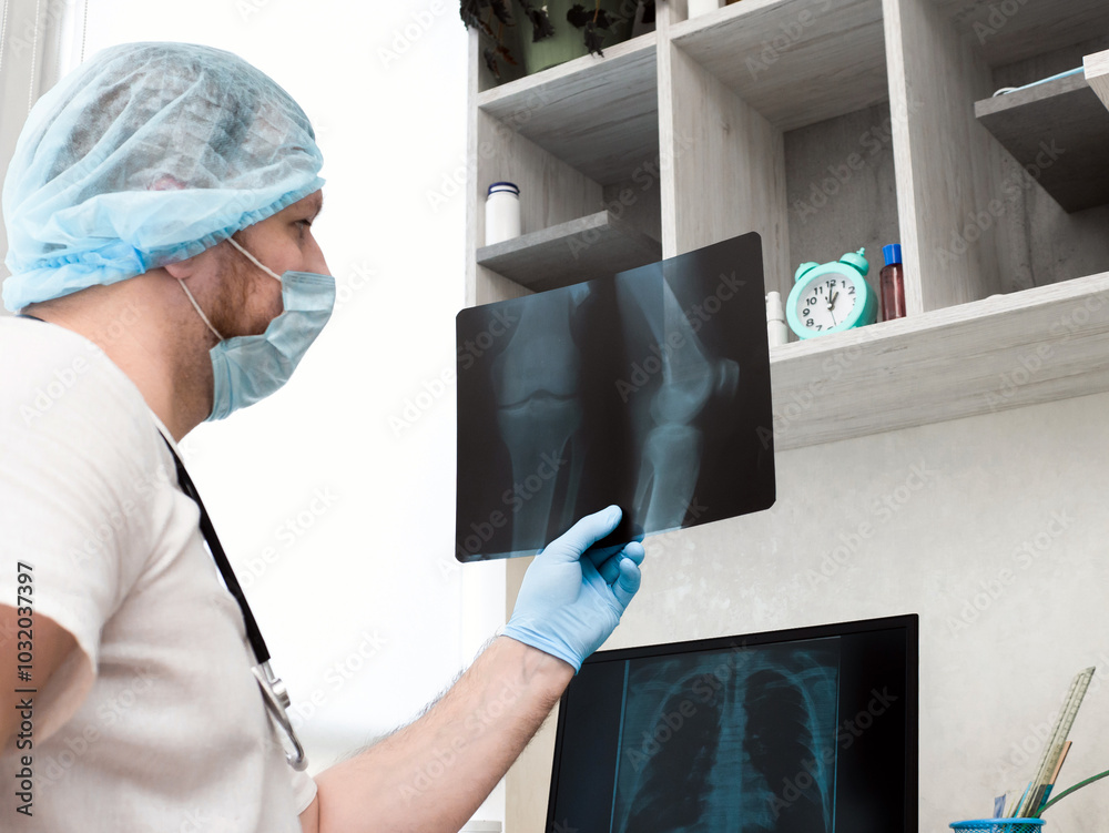 Doctor radiographer, with a stethoscope, in a medical uniform in a clinic, a traumatologist analyzes a broken leg. X-ray of the knee. Ultrasound. Injury of the leg in the knee joint. Osteoporosis