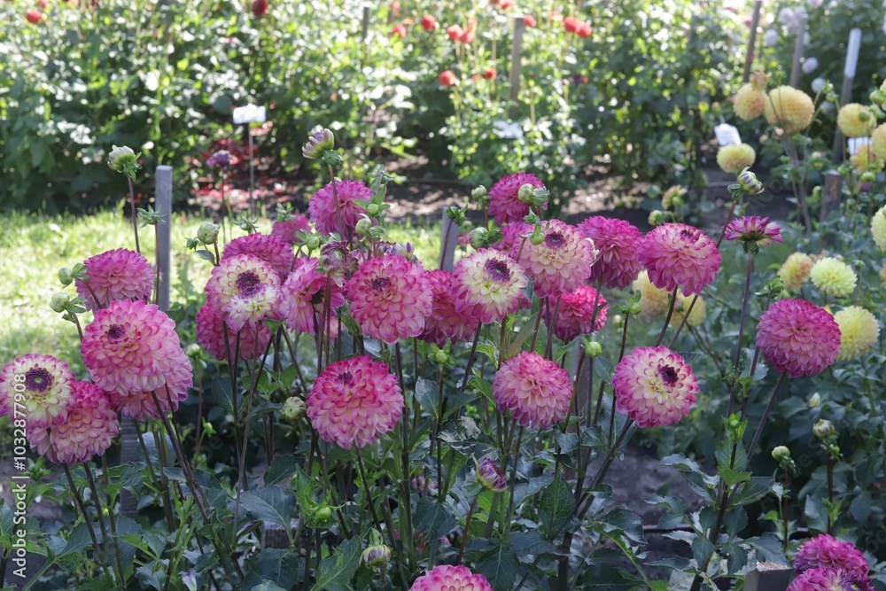 beautiful purple and violet dahlias bloom on a sunny day