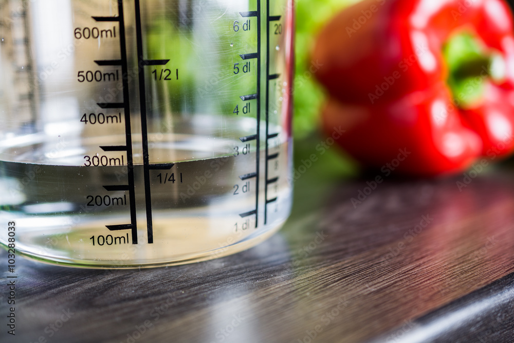 250ccm / 1/4 Liter / 250ml Of Water In A Measuring Cup On A Kitchen Counter With Food