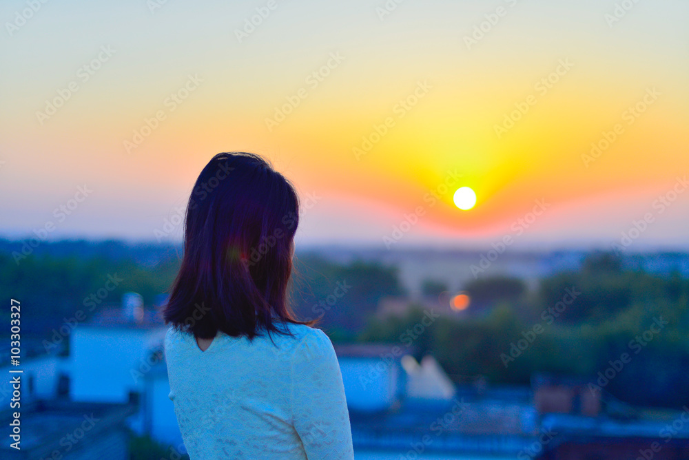 Young woman in rural rooftop enjoy the sunset
