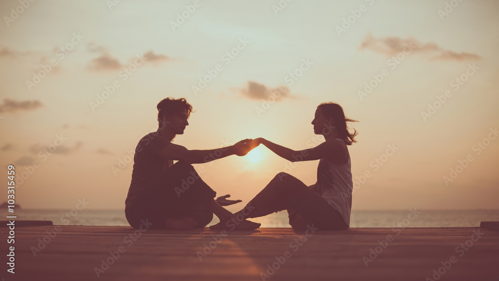 Young couple is doing yoga on the sunrise background.