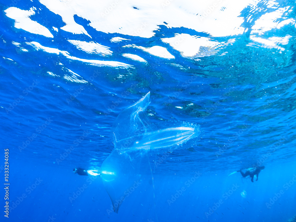 水面を漂う、不思議なカブトクラゲ(カブトクラゲ科)。 英名、学名:Comb jelly (Bolinopsis mikado, Jellyfish) 静岡県伊豆半島賀茂郡南伊豆町中木ヒリゾ浜-2024年