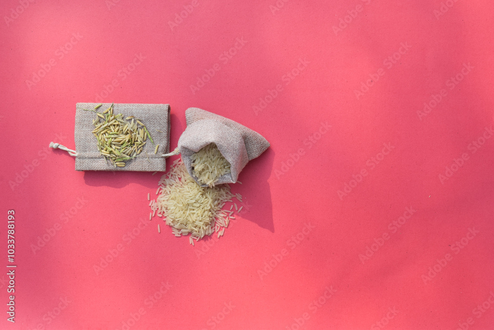 a close up of a green field of rice, a close up of a rice field, a field of green with tall grass, rice field in Pakistan with pink Dp wiith rice in bag
