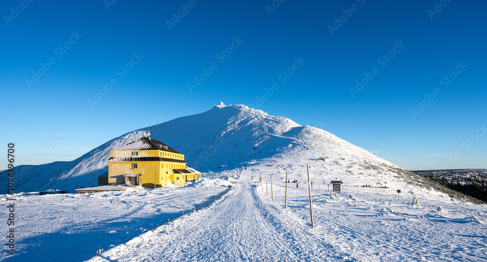 winter landscape under Sniezka summit during sunny day in Karkonosze mountains in Poland