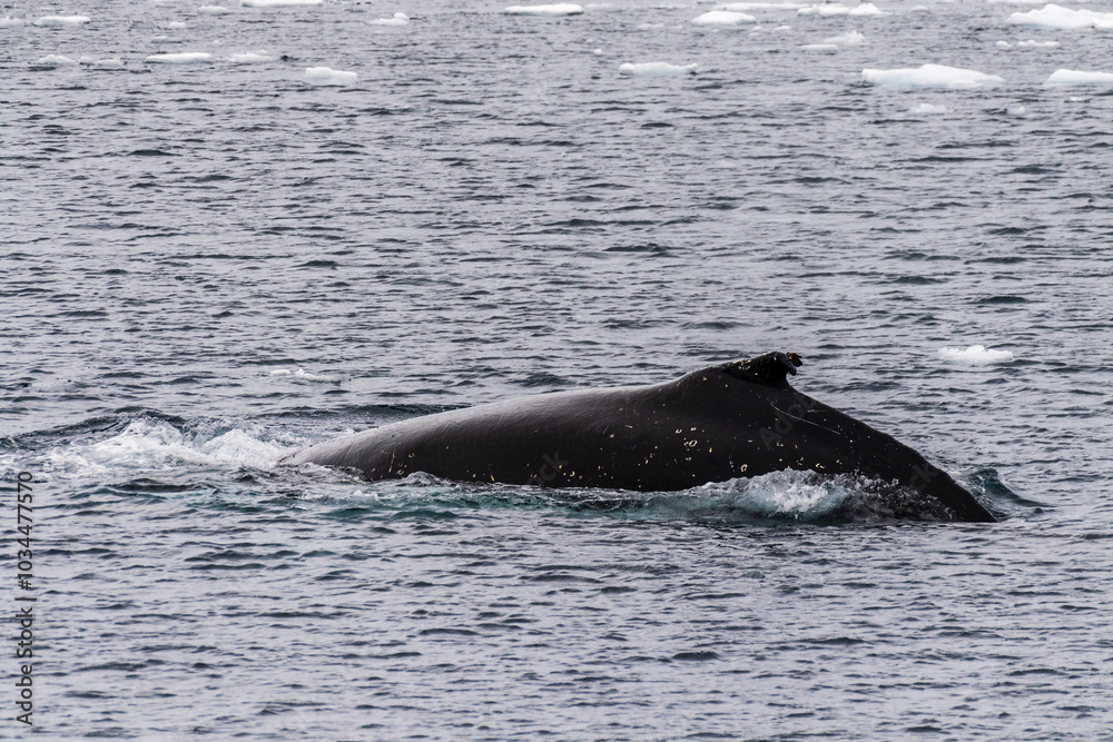 Close-up of the back of a diving humpback whale -Megaptera novaeangliae- including the dorsal fin and blow hole. Image taken inear the entrance of the Lemaire channel, in the Antarctic peninsula.