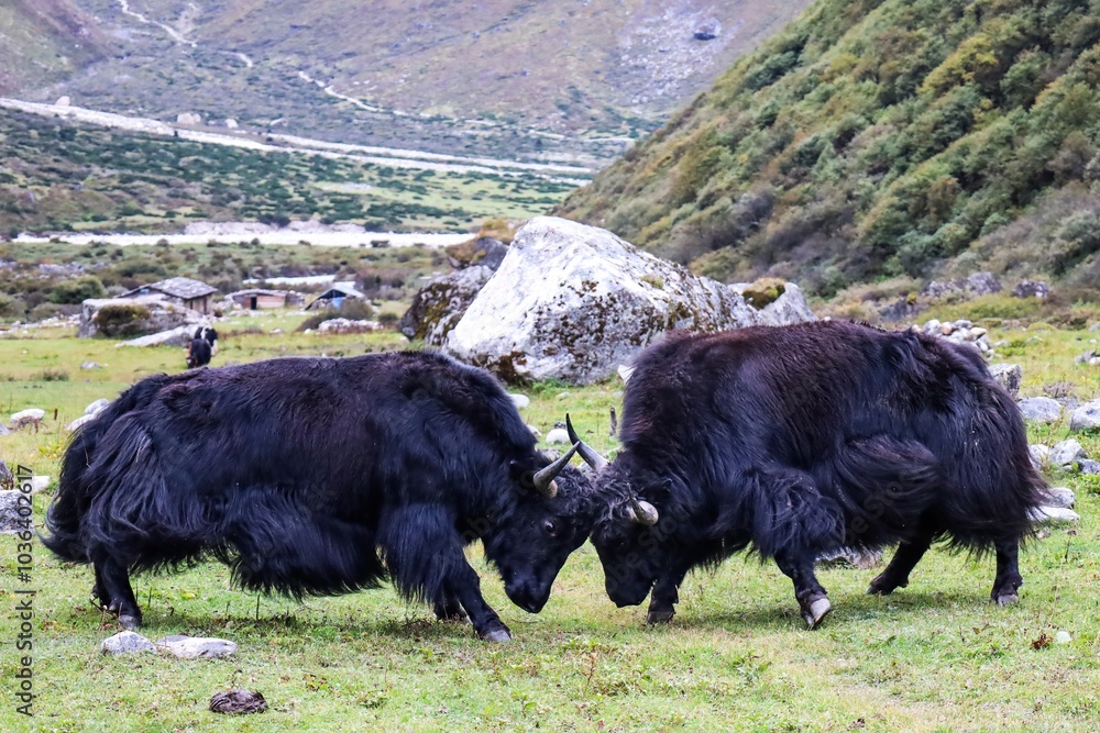 Two powerful yaks locking horns in an intense battle near Kambachen along the Kanchenjunga Base Camp (KBC) trekking route in the Nepalese Himalayas, surrounded by rugged mountains and lush valleys.