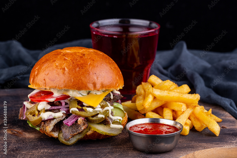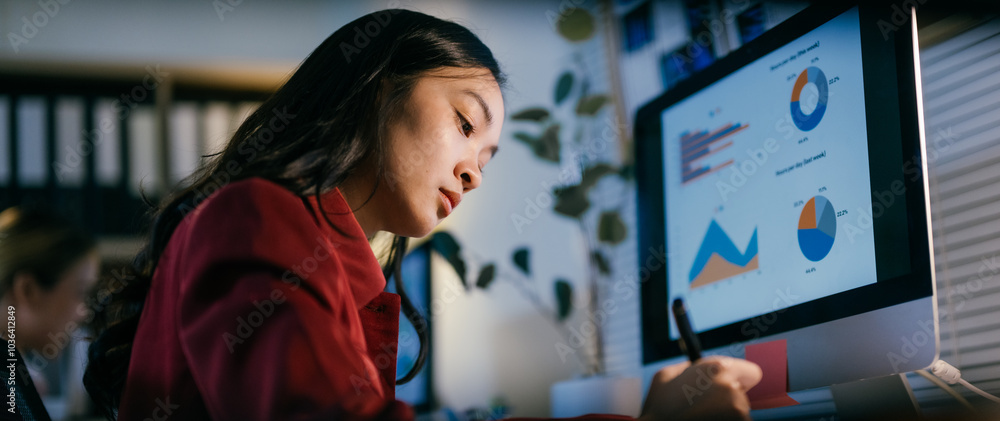 Focused businesswoman works late in an office, reviewing data on her computer screen. The scene captures hard work, determination, and success in the corporate world