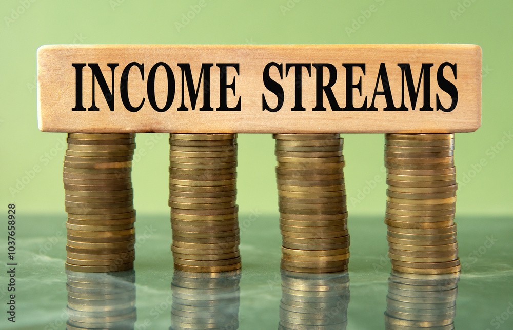 INCOME STREAMS - words on a wooden block on a background of stacks of coins