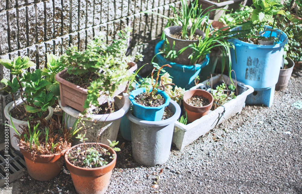 道端に置かれた複数の鉢植え