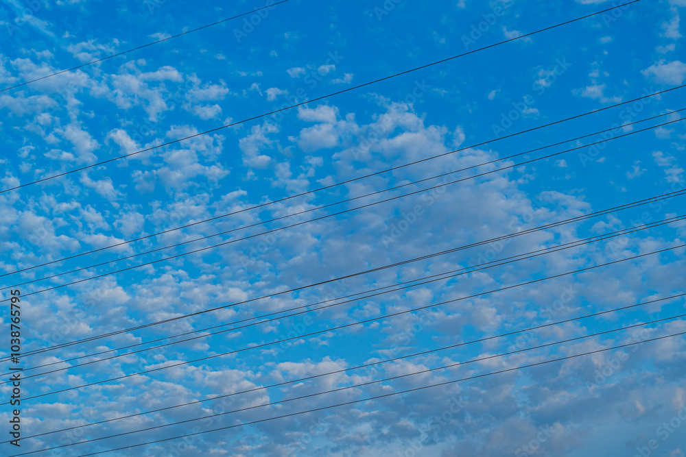 A serene sky with scattered clouds and power lines, ideal for backgrounds or nature themes. The image captures the tranquility and the intersection of man-made structures with natural beauty