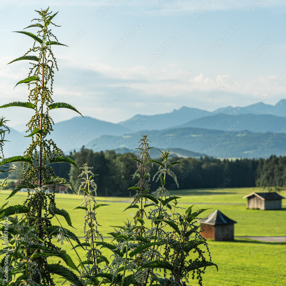 A serene landscape with vibrant green nettle plants in the foreground, quaint wooden huts scattered across a lush meadow, and majestic mountains under a clear blue sky. Ideal for nature & rural themes