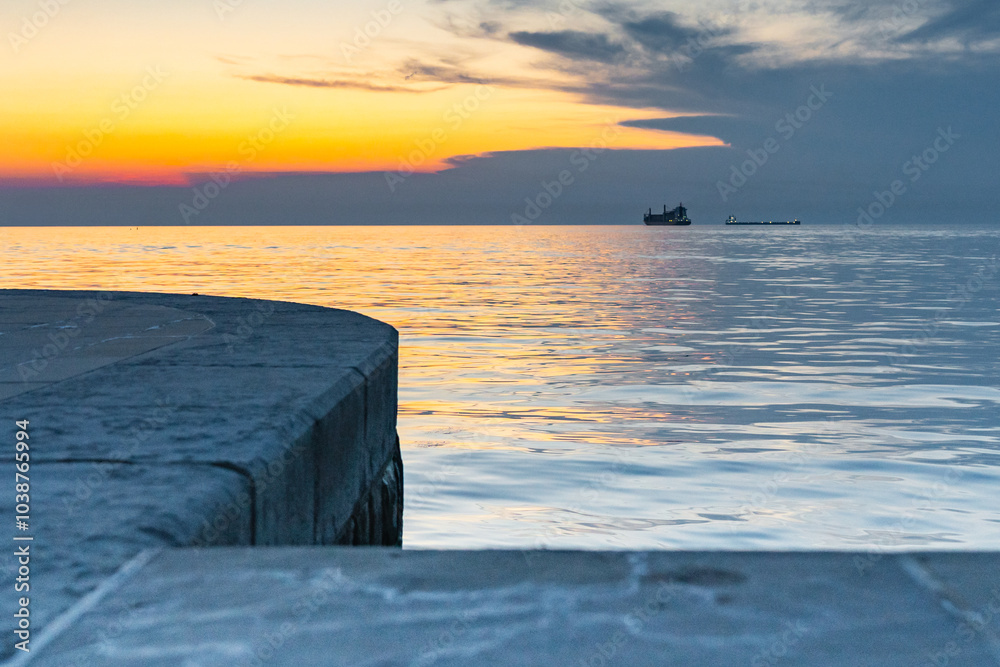 A serene seascape at sunset with vibrant hues of orange and blue reflecting on calm water. A distant ship under the vast, colorful sky adds tranquility. Ideal for travel themes