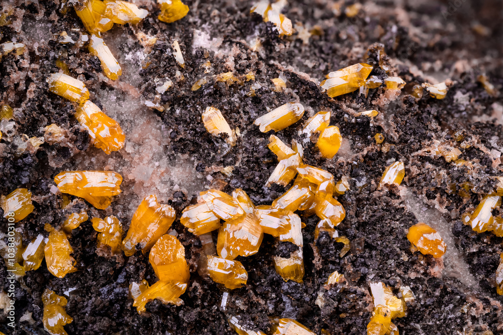 Yellow Mimetite crystals on Dolomite. Specimen from Potosí Mine, Aquiles Serdán, Mexico. Micro photography extreme close-up. microscope mineral crystal photography for Scientific use