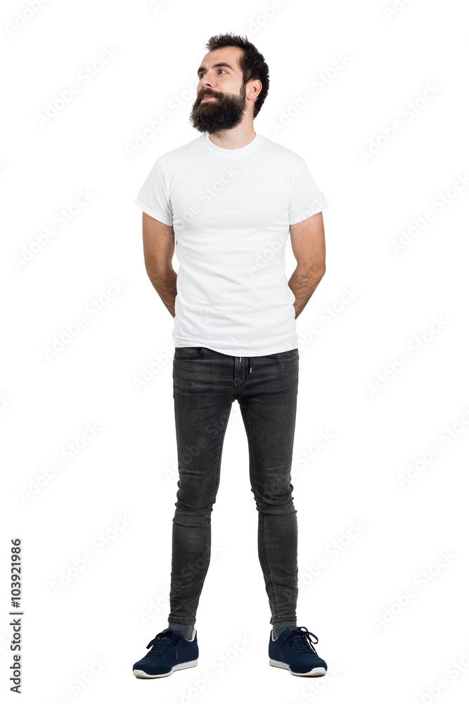 Smiling bearded man wearing white t-shirt and tight jeans looking away. Full body length portrait isolated over white studio background.