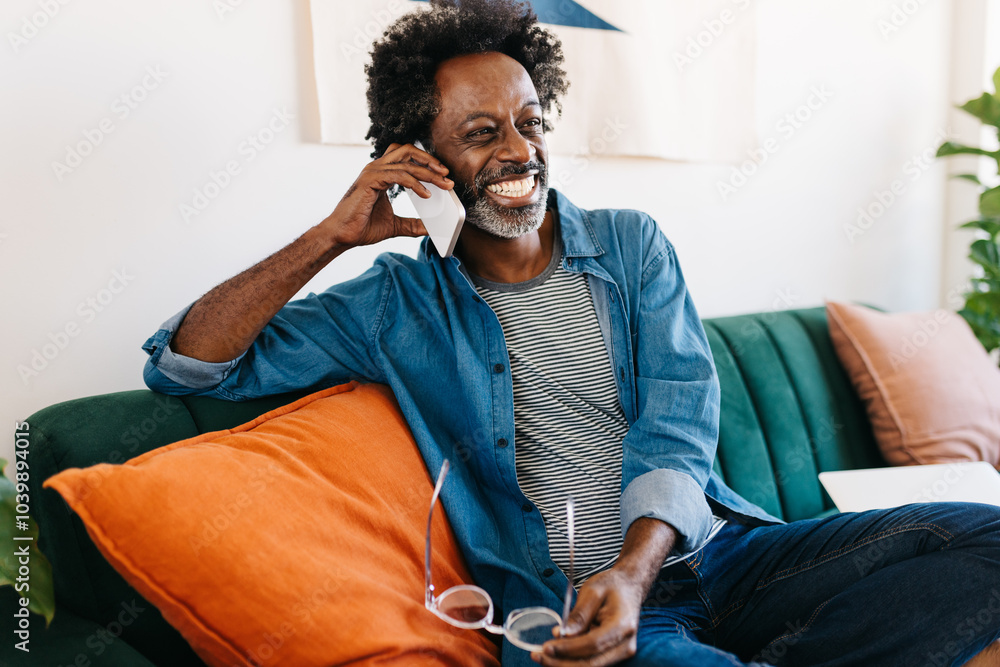 Happy mature man relaxing on a sofa, using his mobile phone to make a call