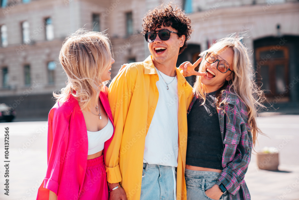 Group of young three stylish friends posing in the street. Fashion man and two cute female dressed in casual summer clothes. Smiling models having fun. Cheerful women and guy outdoors, sunglasses
