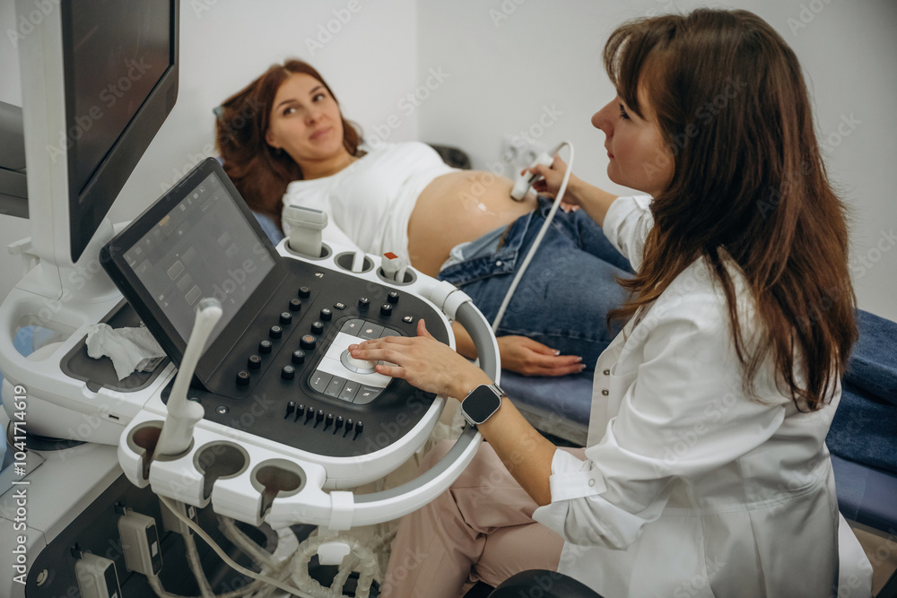 Conception of anticipation. Pregnant woman undergoing ultrasound test