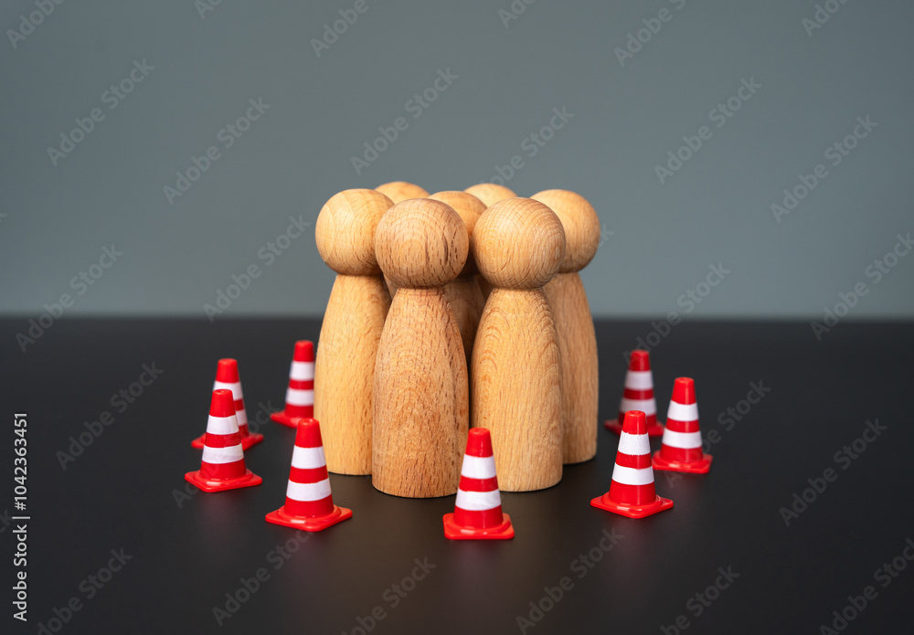 A group of people are surrounded by traffic cones. Limitations and boundaries. Rights and freedoms. Control and supervision, infringement of minorities. Safety
