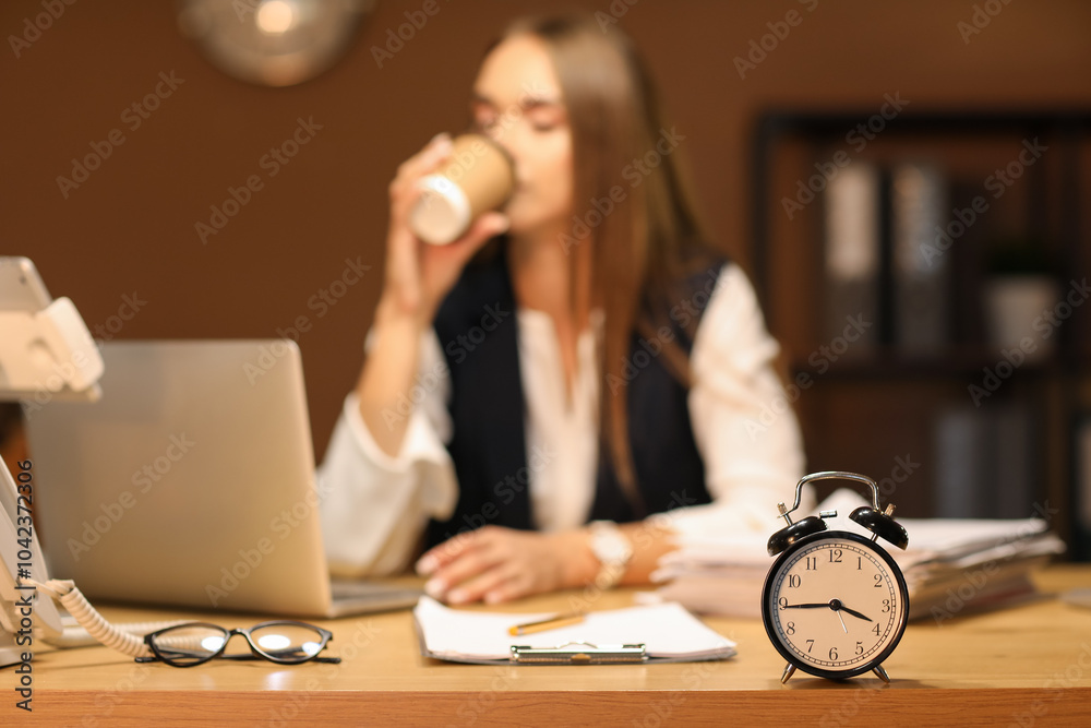 Alarm clock on table against businesswoman drinking coffee and trying to meet deadline in office at night, closeup