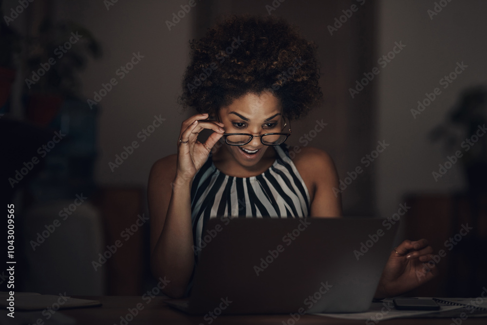Surprise, night and businesswoman with laptop in home for positive feedback with client on remote work. Happy, shock and female freelance copywriter reading celebrity gossip blog online with computer