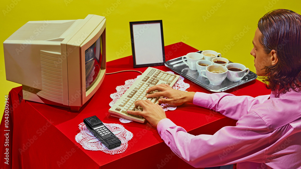 Person typing at vintage computer, with tray of multiple cups of coffee beside them. Retro setting contrasts with overload of coffee cups. Concept of business, work-life balance. Pop art. Nostalgia.
