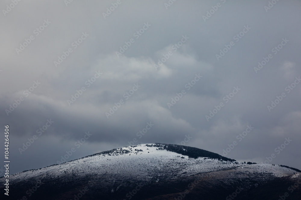 View of the mountains near the Moncayo natural park, covered in snow in winter, under a cold gray sky, Aragon, Spain