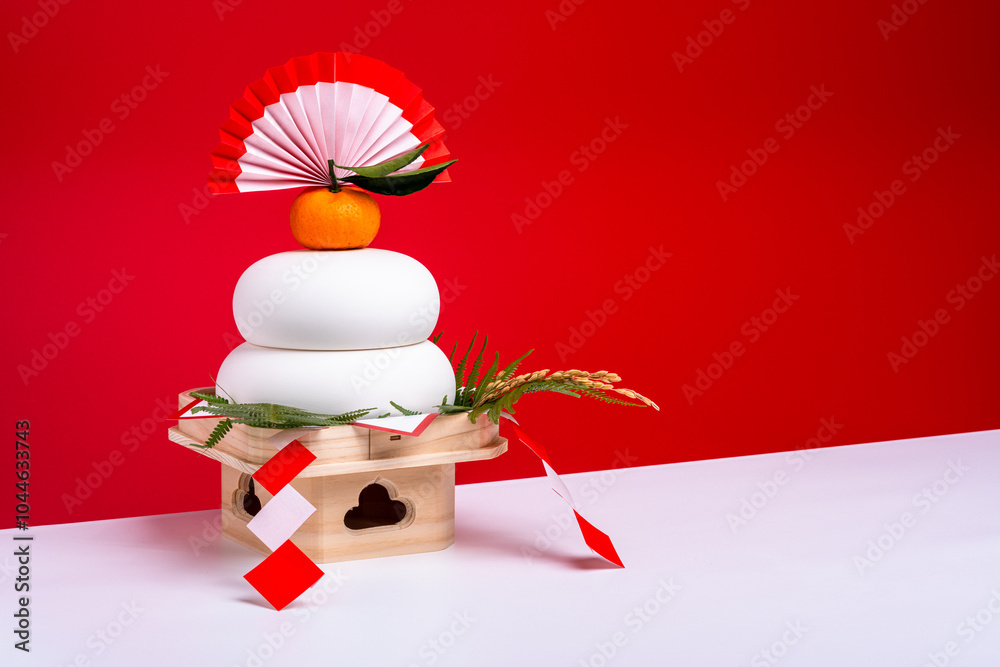 “鏡餅“を左側に配置した写真 紅白背景 低い三宝(台座)あり