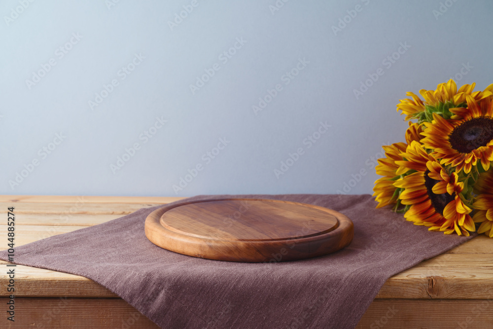 Empty wooden round board with sunflowers on wooden table. Thanksgiving background mock up for design and product display