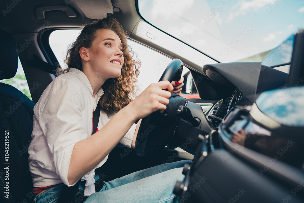 Photo of afraid funny girl wear white shirt smiling riding vehicle test drive car outdoors urban city street