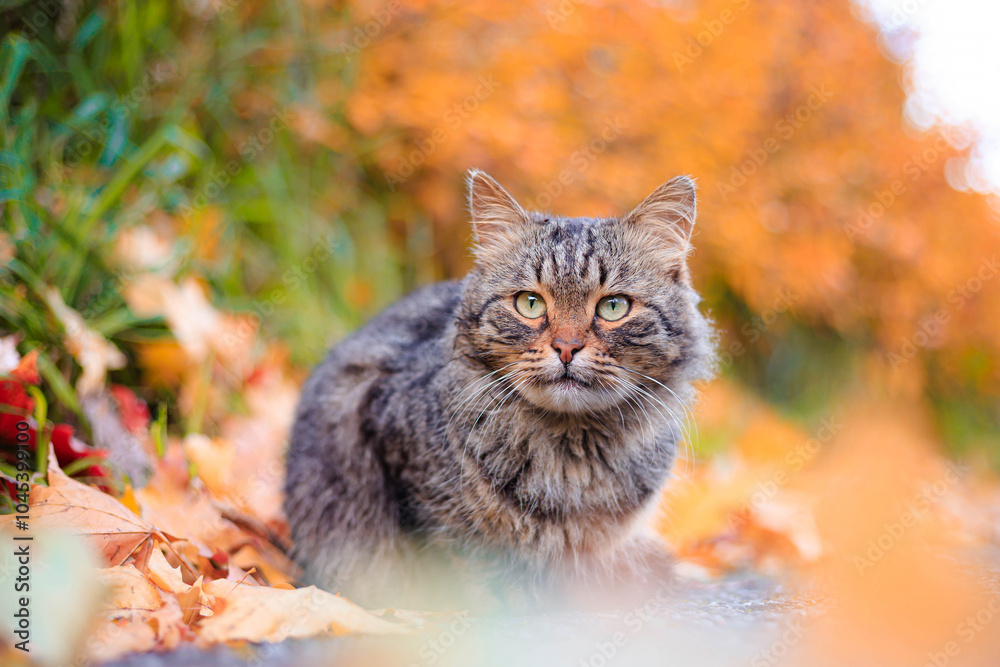 Autumn portrait of a cat. A colored cat. a pet. Photos for printed products . Autumn is golden . Animal. High quality photo