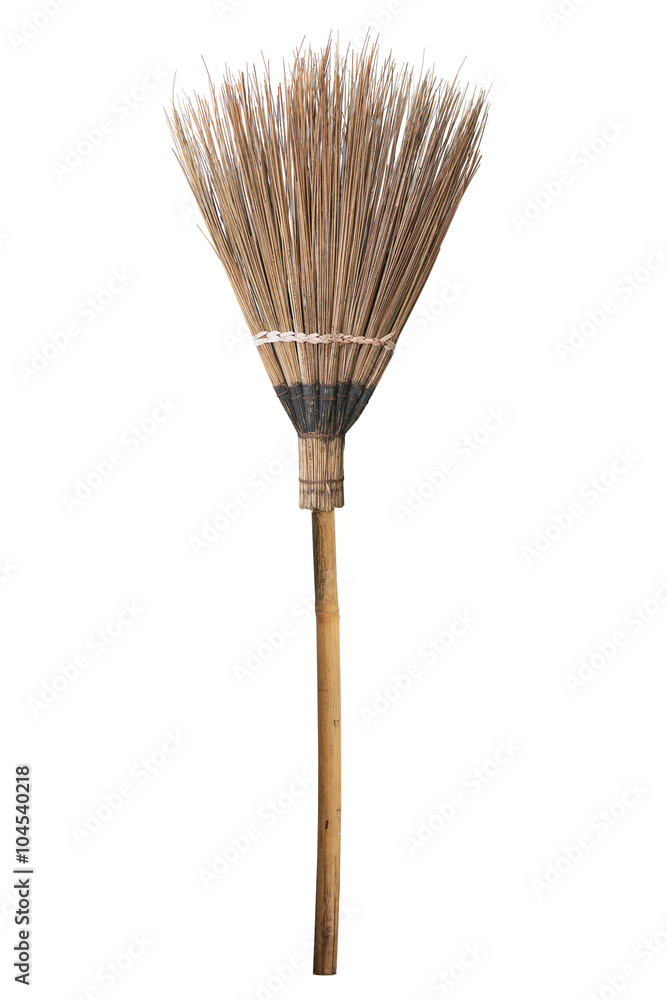 broom for cleaning on dirty floor, cleaning set in house or work place, old broom isolate on white background.