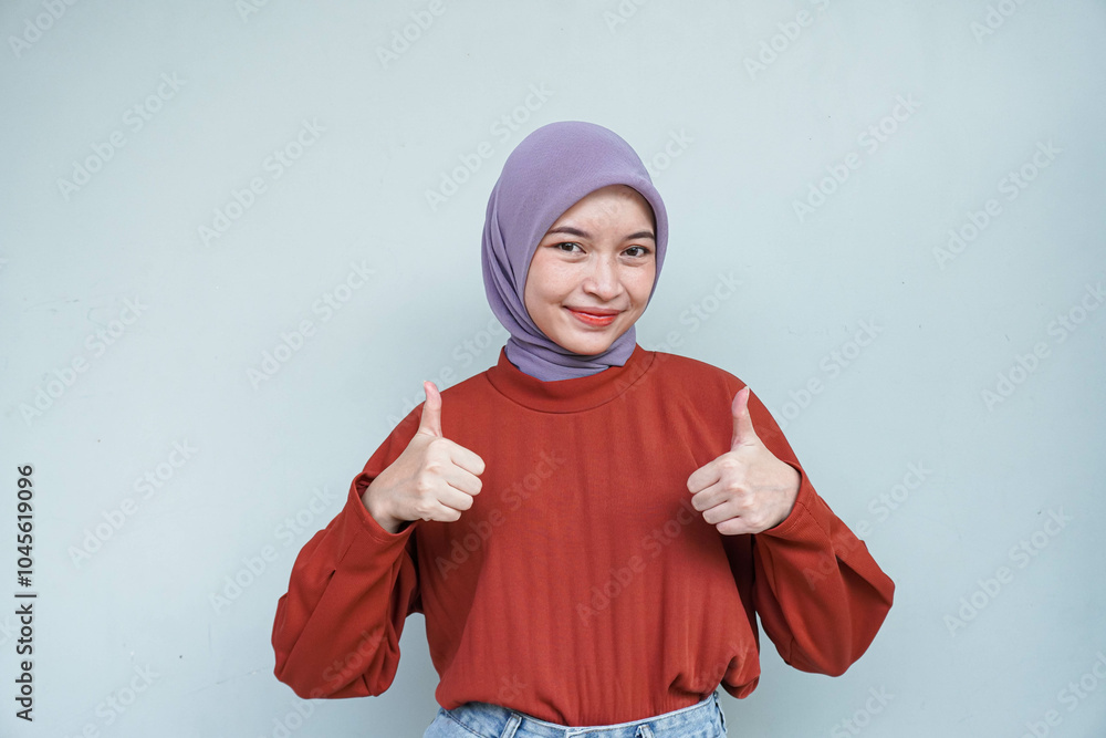 Happy young Asian Muslim woman wearing hijab with thumbs up gesture. Isolated white background.