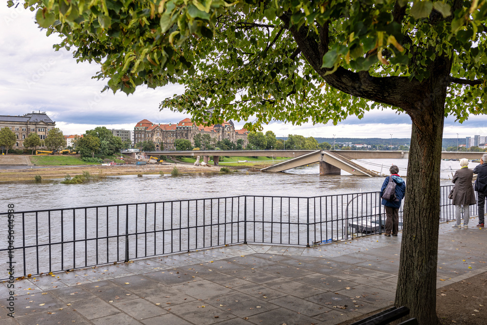 Scenic View of Elbe River Near Dresden Featuring Collapsed Bridge, Spectators, and Tree in Foreground with Open Space and Dramatic Landscape on Left Side