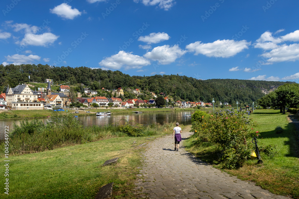 Woman in Hiking Gear Walks Along Brick Path Toward Elbe River on Sunny Summer Day with Fleecy Clouds, Open Space, and Wehlen Village Across the Water, Perfect for Scenic Travel and Outdoor Adventure