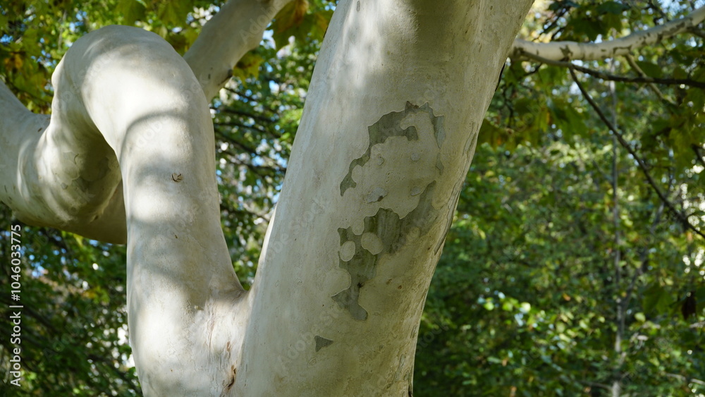 The trunk, bark, leaves and fruits of Platanus occidentalis, also known as the American, London plane tree. Bark of the sycamore tree. Maple. Sycamore. Different colors of the tree trunk. Platan. n