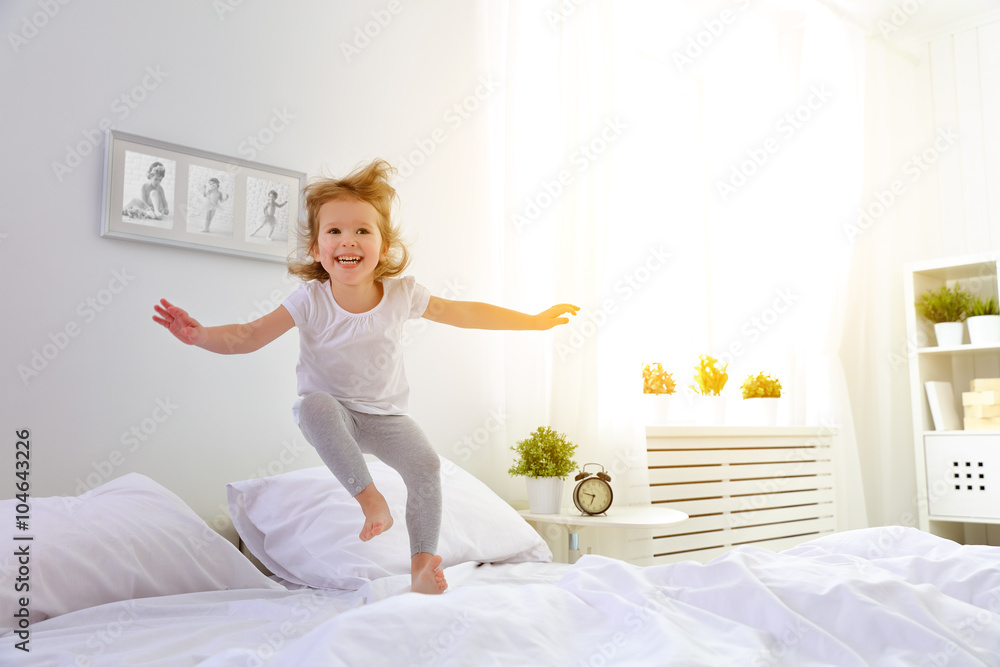 happy child girl jumps and plays bed