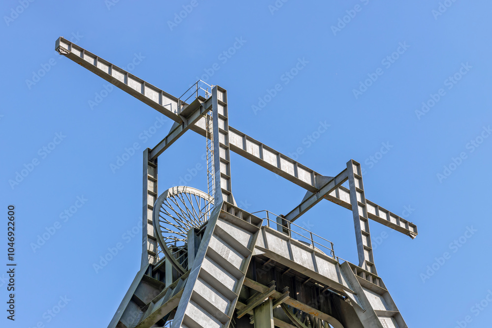 Barony A-Frame pithead winding head gear tower metal wheels with spokes, historic industrial heritage site East Ayrshire Scotland