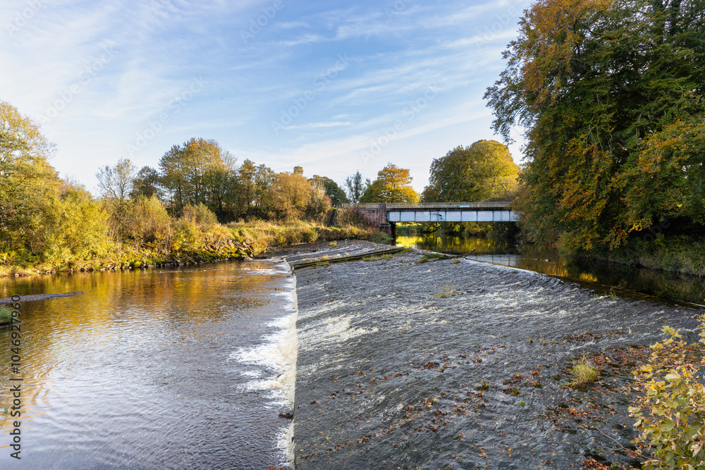 Mill weir on Lugar Water, Ochiltree, Scotland, with autumn foliage on trees and bushes and metal road bridge