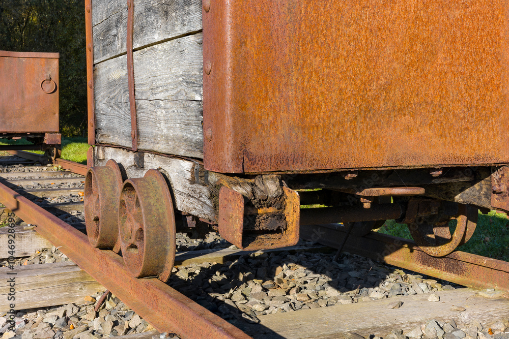 Rusty coal mine hutches or small wagons on narrow gauge rail tracks above ground