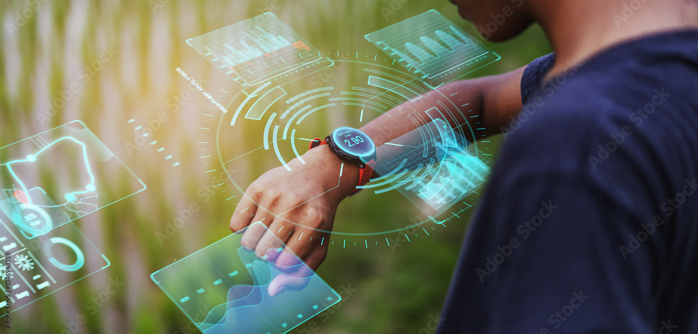 Athlete runner using smartwatch UI assistance technology performance enhancing tracking concept, training fitness sport leisure activity for healthy lifestyle, futuristic holographic ai hologram