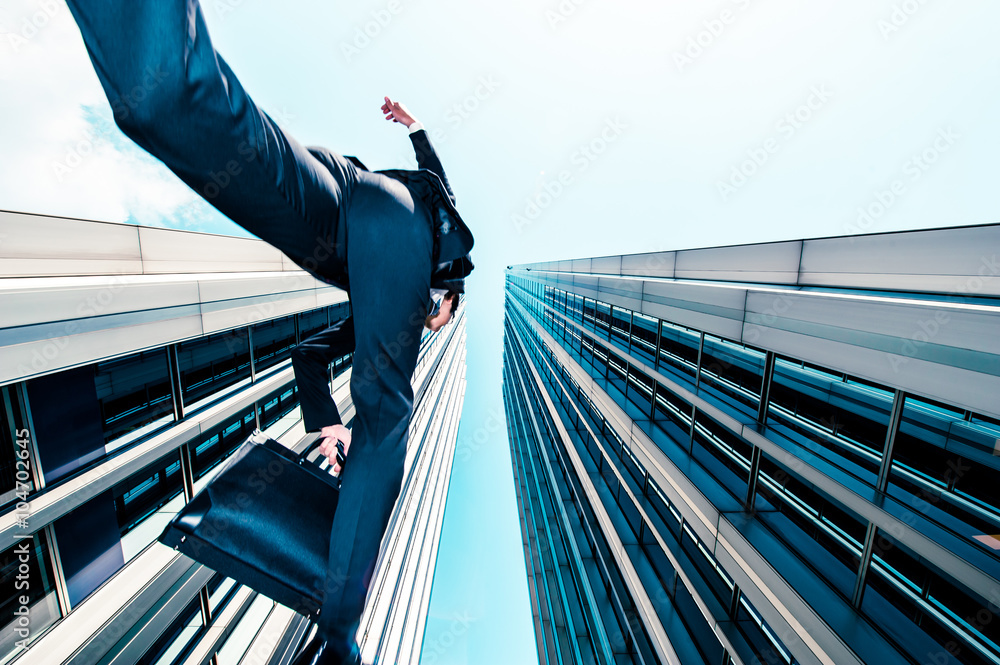 カメラの上を飛び越えるビジネスマン,ローアングル,ビルの背景