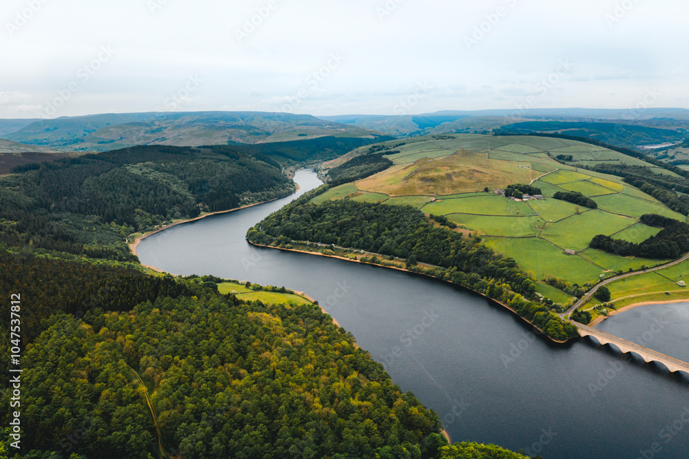 Aerial view wtih beautiful green landscape Derwent Dam, snake road bridge Peak District