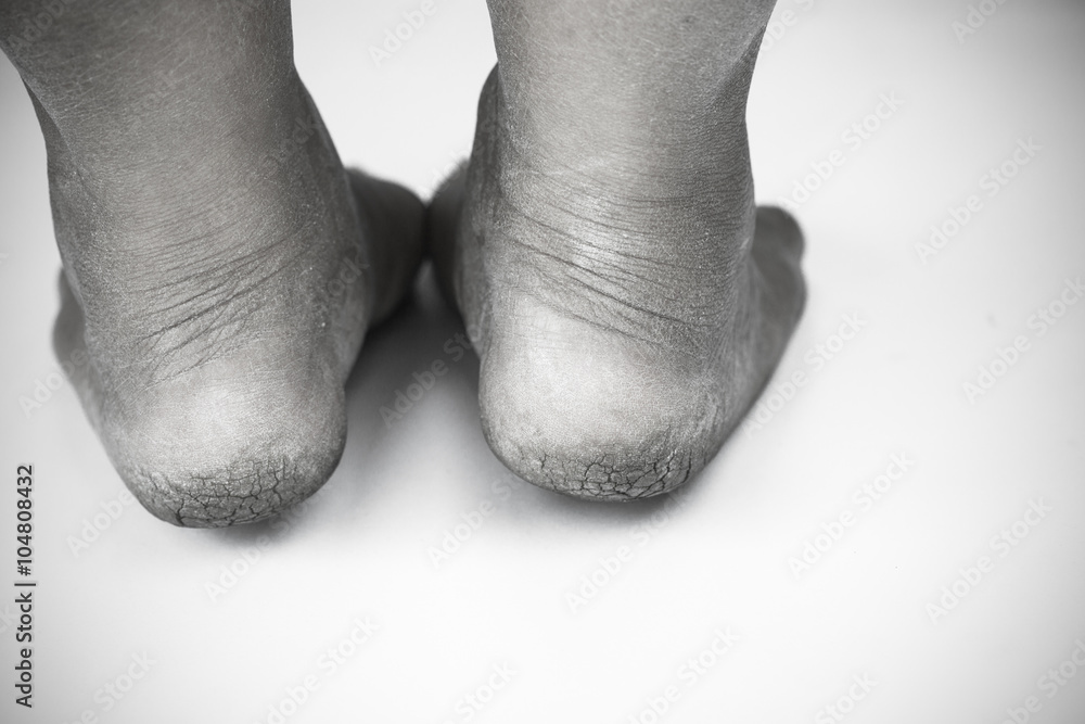 monochrome or back and white of dirty foot or cracked heels isolate on white background, medical or feet health of the people, medical center for heels or feet.