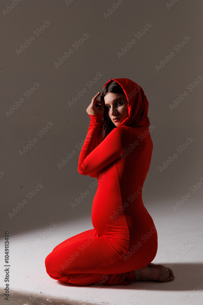 Beautiful young pregnant brunette girl. A woman waiting for a baby in a red dress with red hood, on grey background, in the studio.