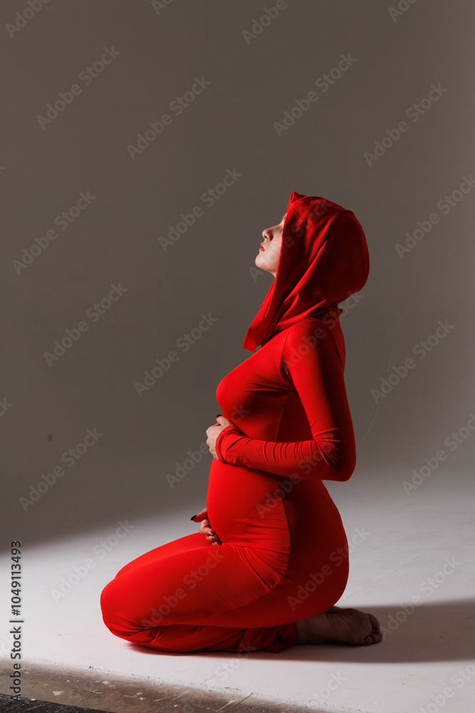 Beautiful young pregnant brunette girl. A woman waiting for a baby in a red dress with red hood, on grey background, in the studio.