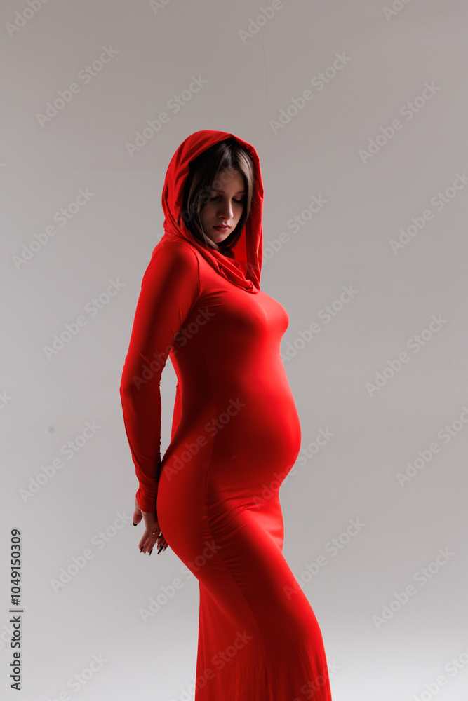 Beautiful young pregnant brunette girl. A woman waiting for a baby in a red dress with red hood, on grey background, in the studio.
